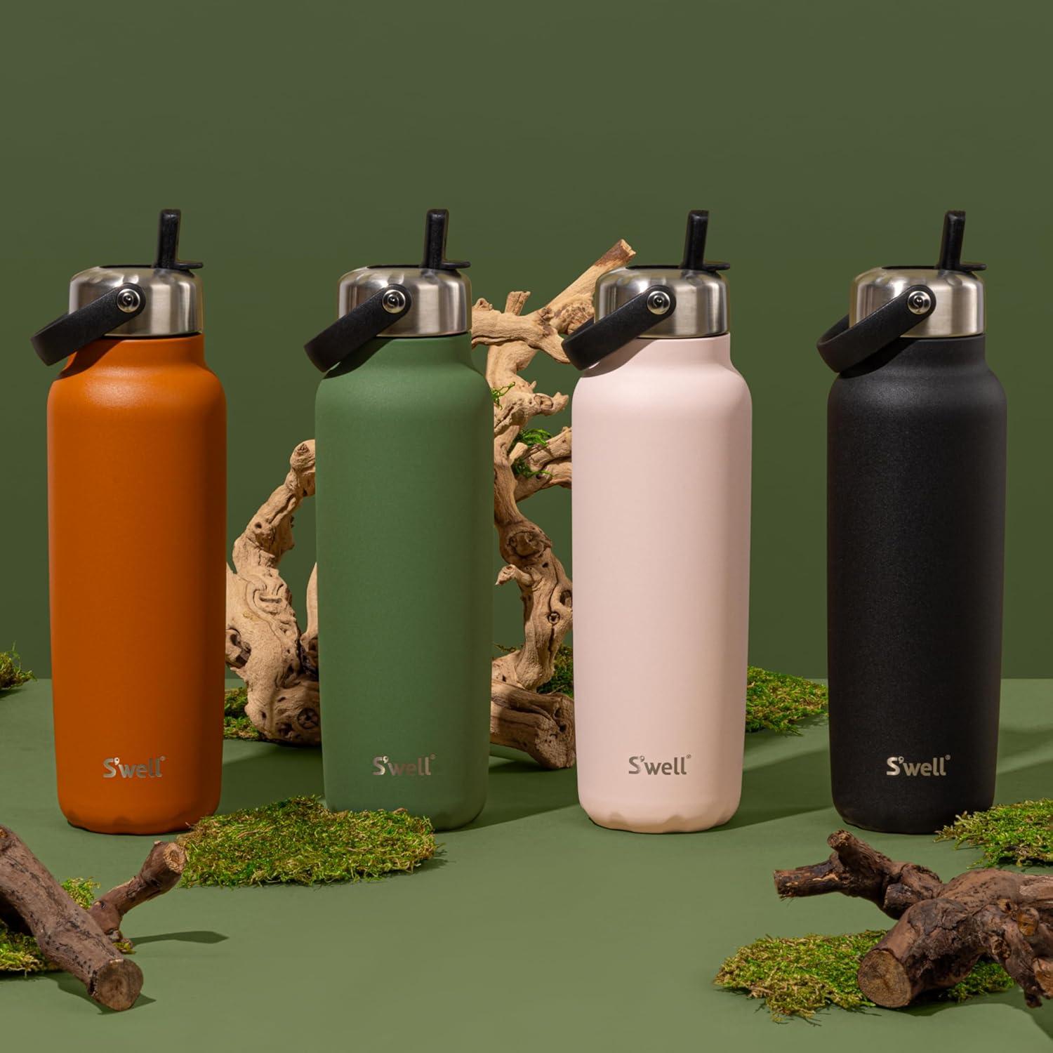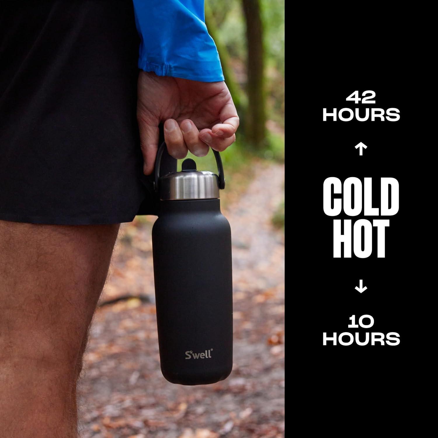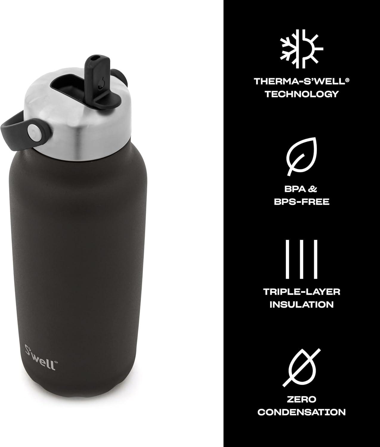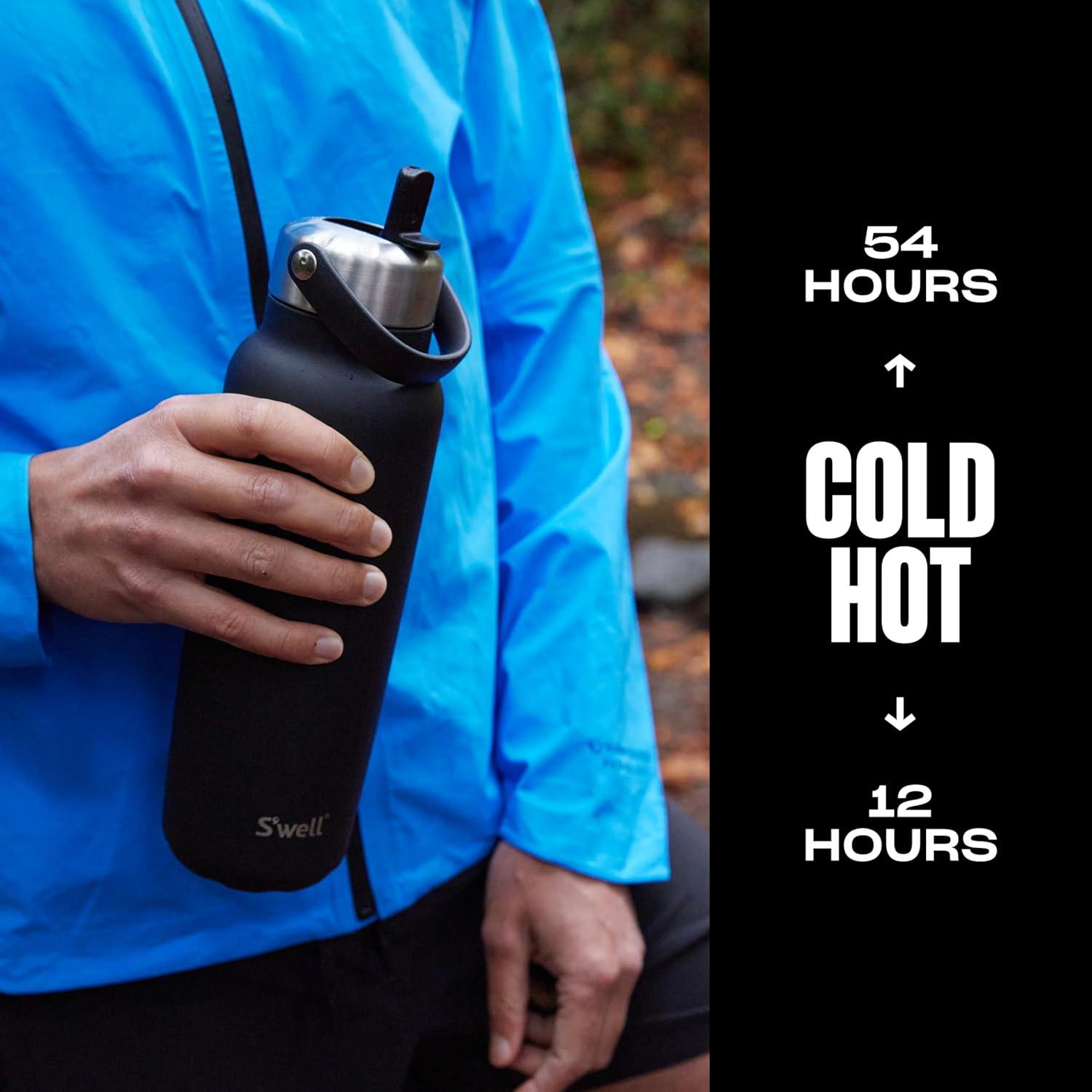 TRIPLE-LAYERED INSULATION: S’well 40oz Explorer with recycled stainless steel. Triple-layered, vacuum-insulated construction keeps drinks cold for 54 hours and hot for 12. Dishwasher safe. Flip Straw Lid is top-rack only.